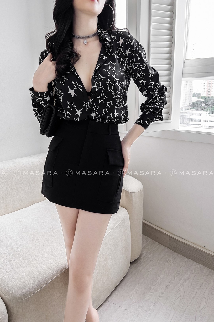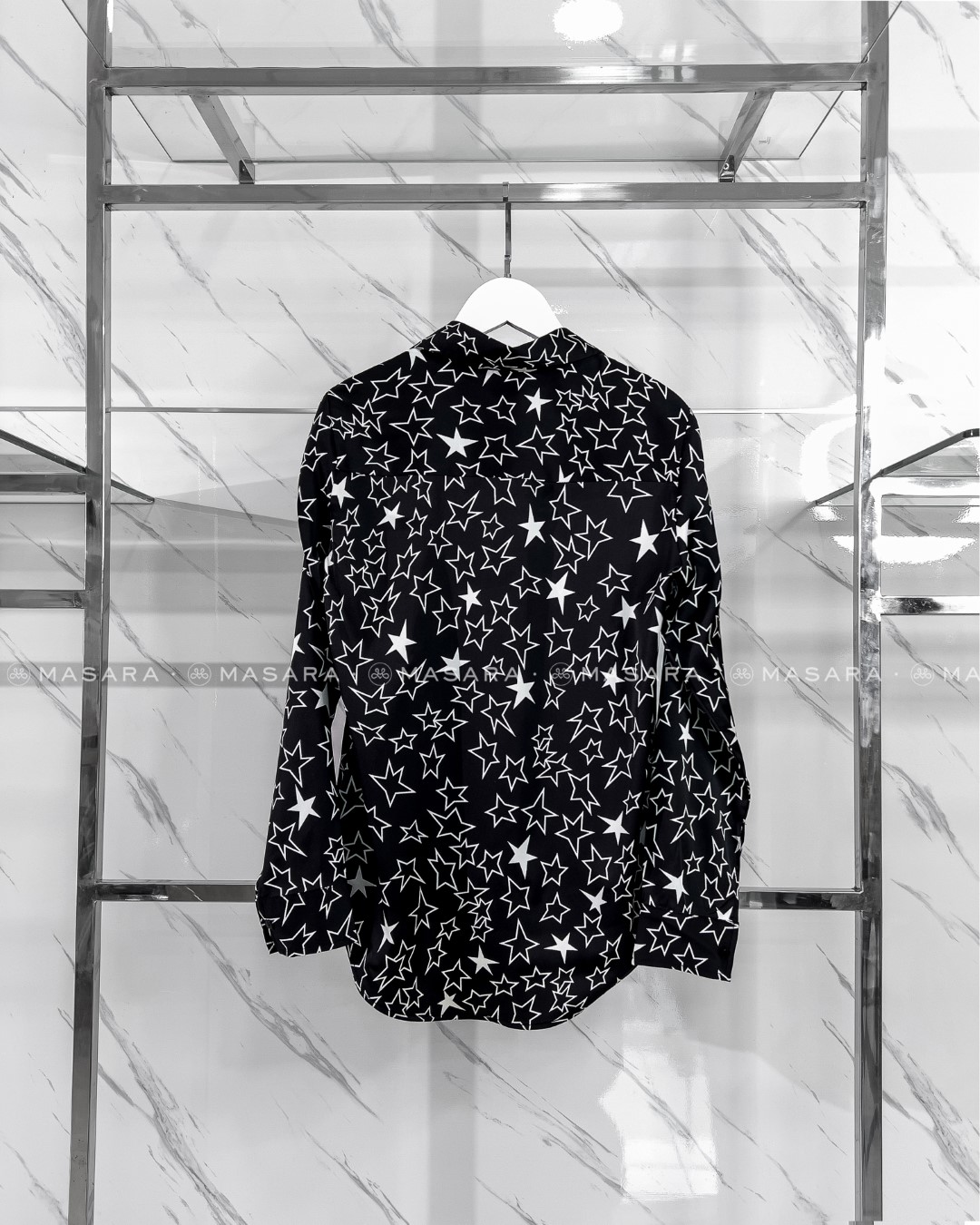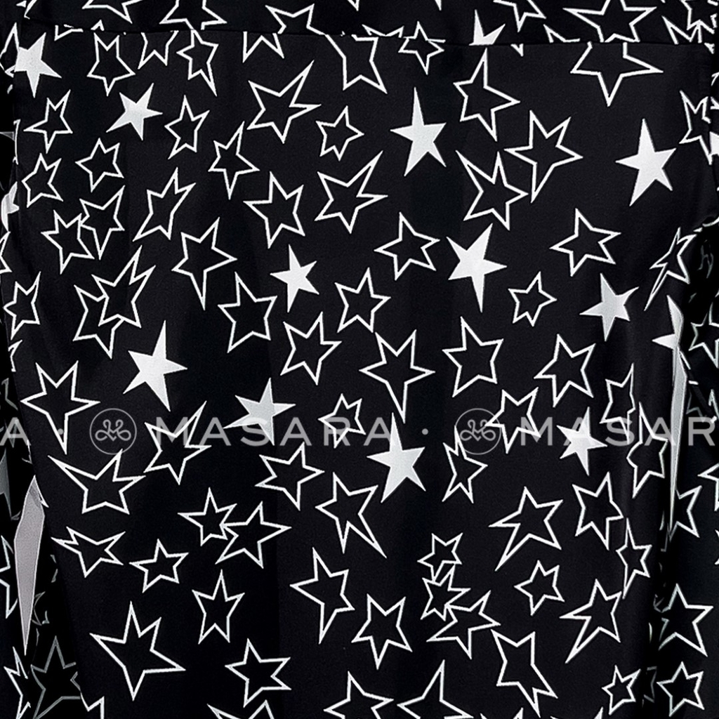 Sơ mi lụa đen hoạ tiết ngôi sao trắng trên nền đen mang lại vẻ đẹp cuốn hút một chút huyền bí và sang trọng