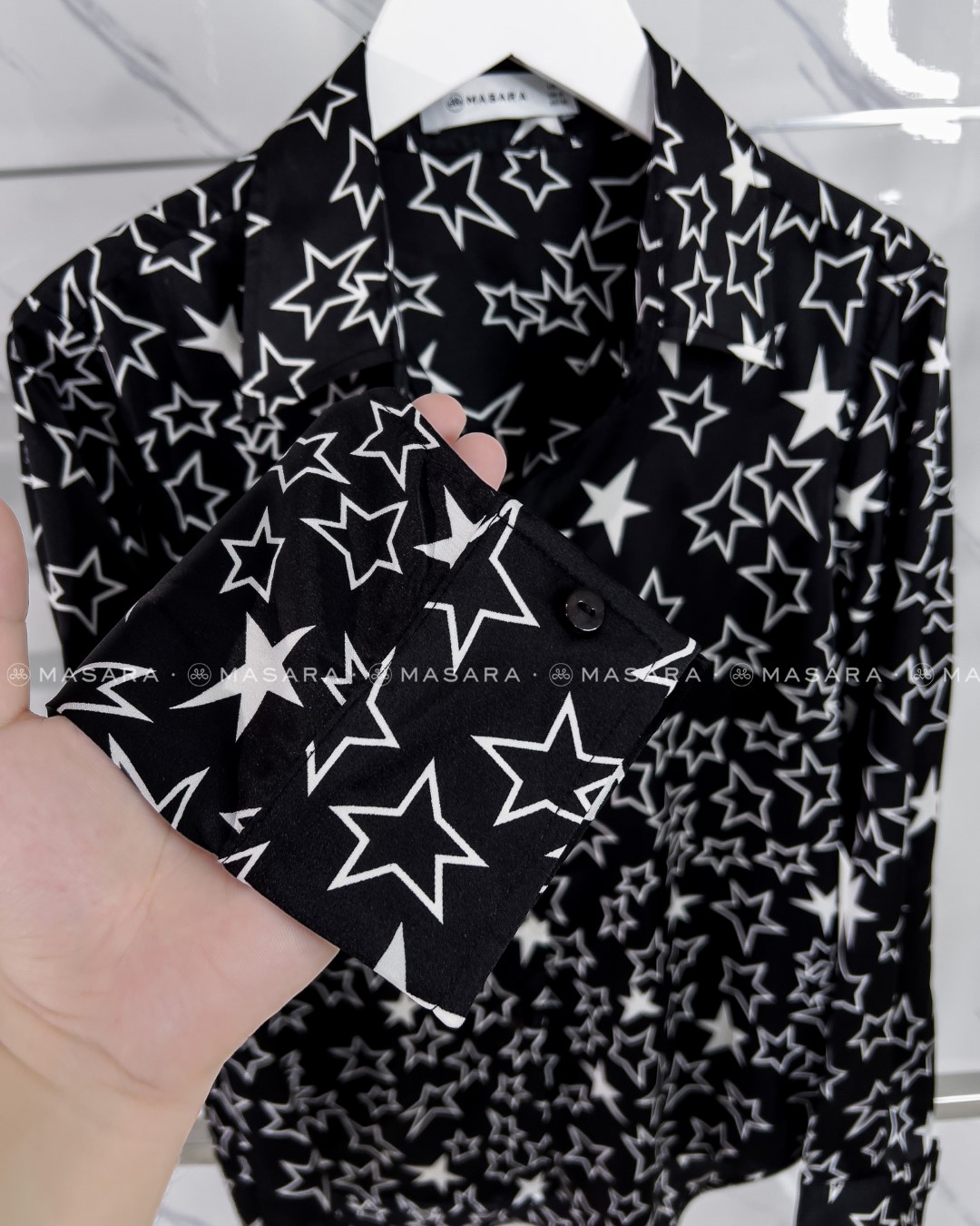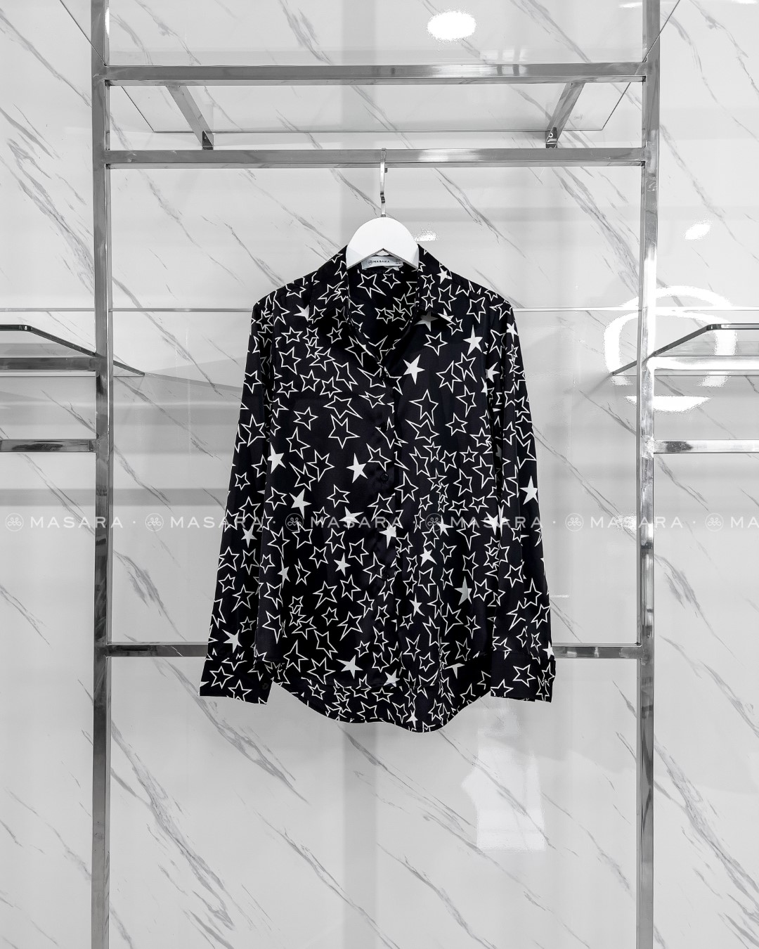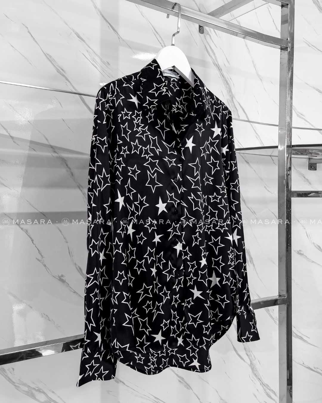Sơ mi lụa đen hoạ tiết ngôi sao trắng trên nền đen mang lại vẻ đẹp cuốn hút một chút huyền bí và sang trọng