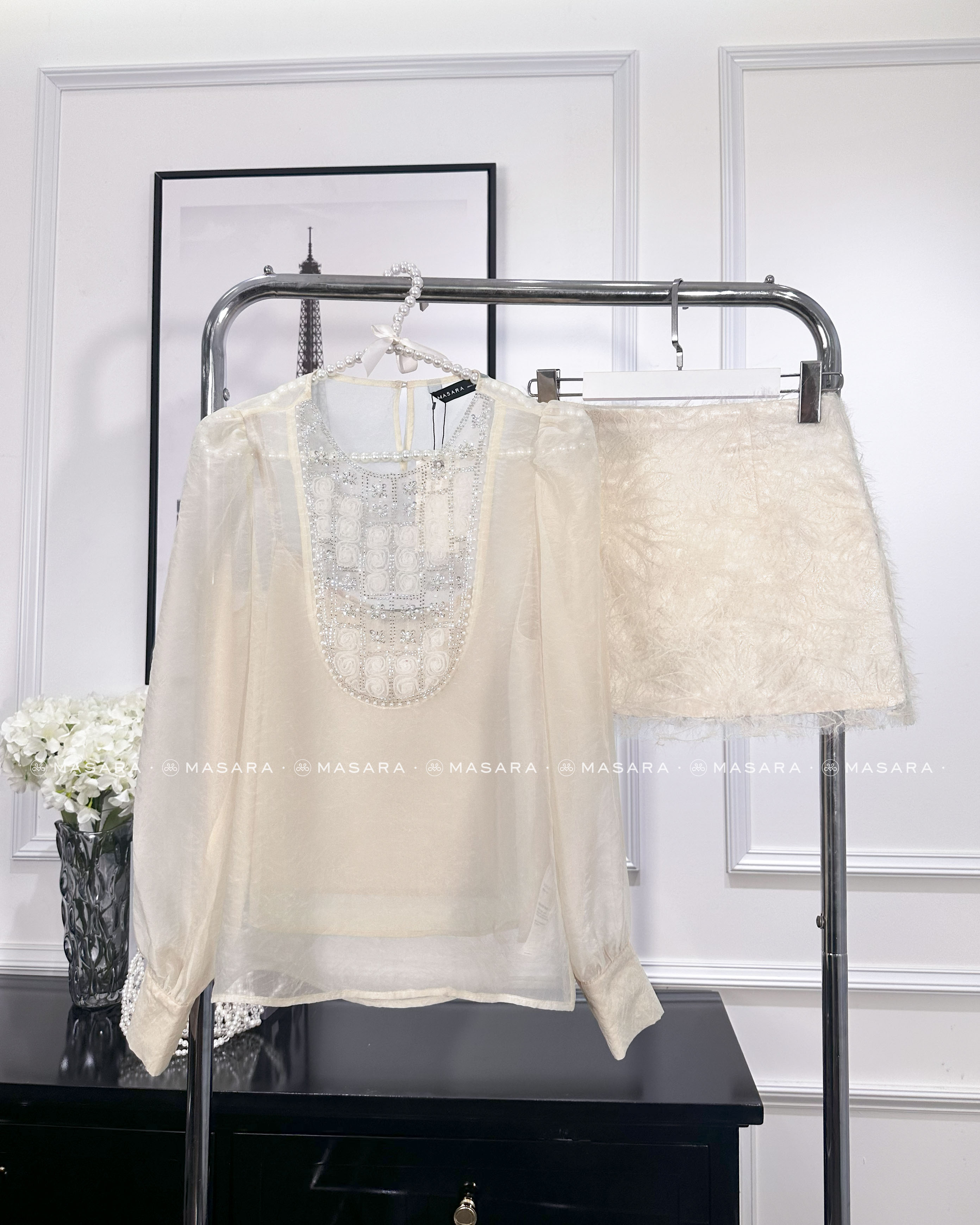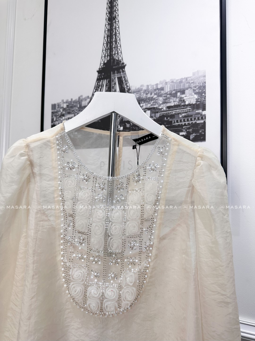 - Trước ngực áo phối hạt ngọc, xếp hình hoa rất nổi bật