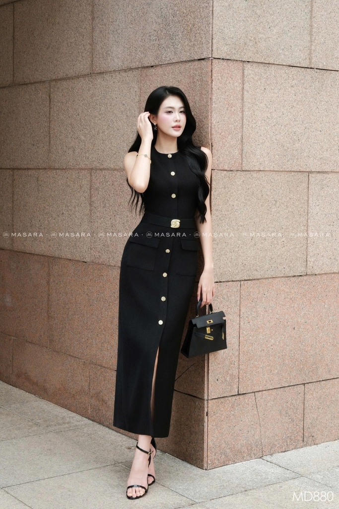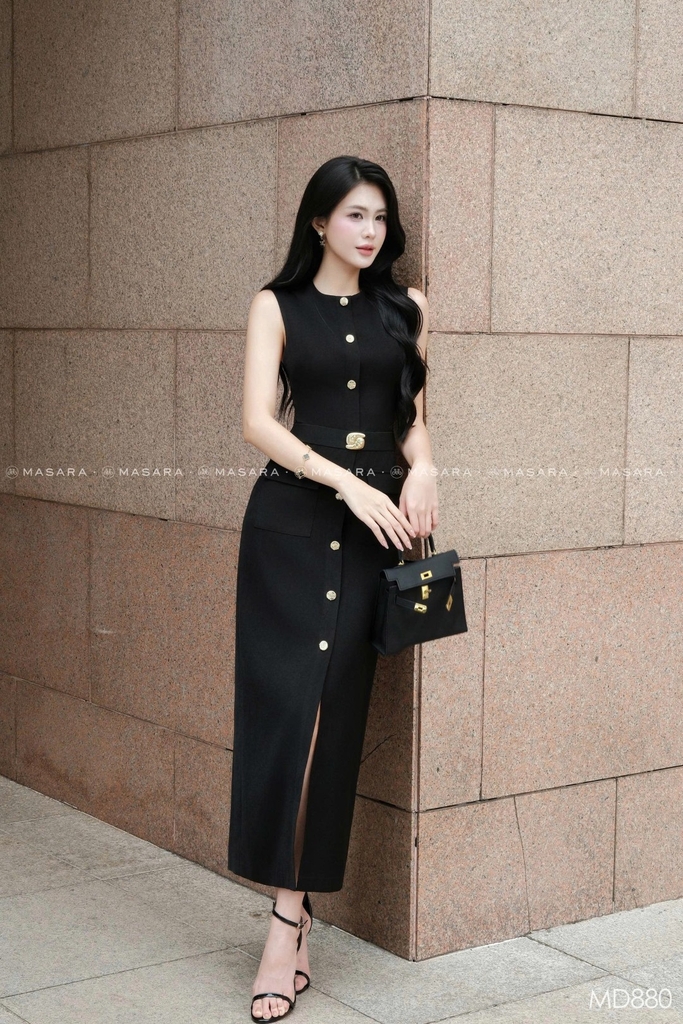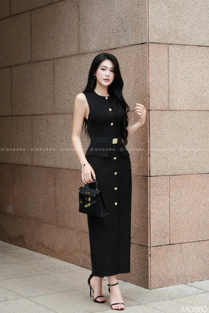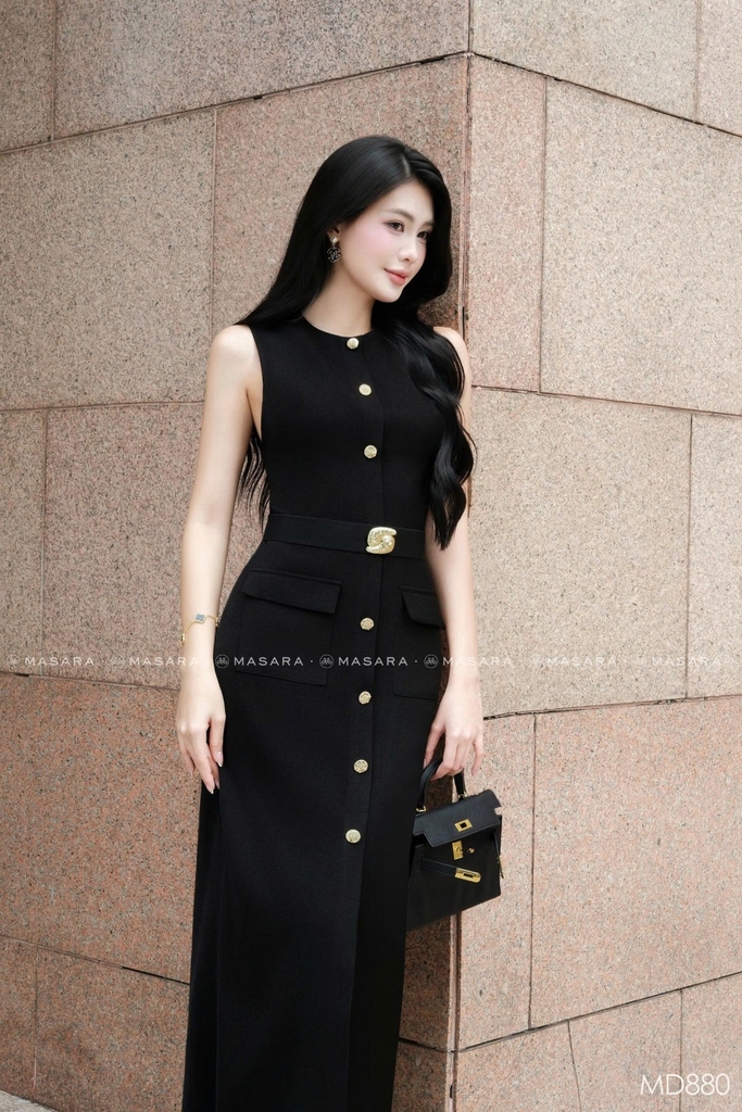 - Hàng nút ánh kim chạy dọc thân tạo điểm sáng sang trọng cho mẫu đầm đen tối giản