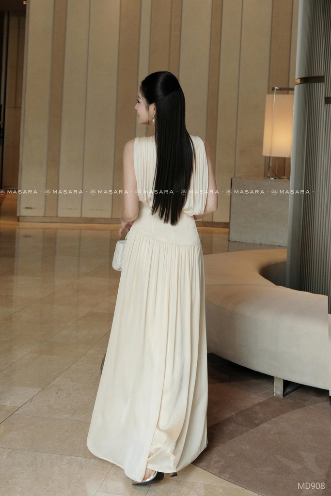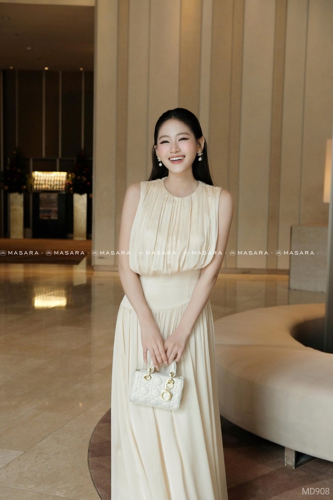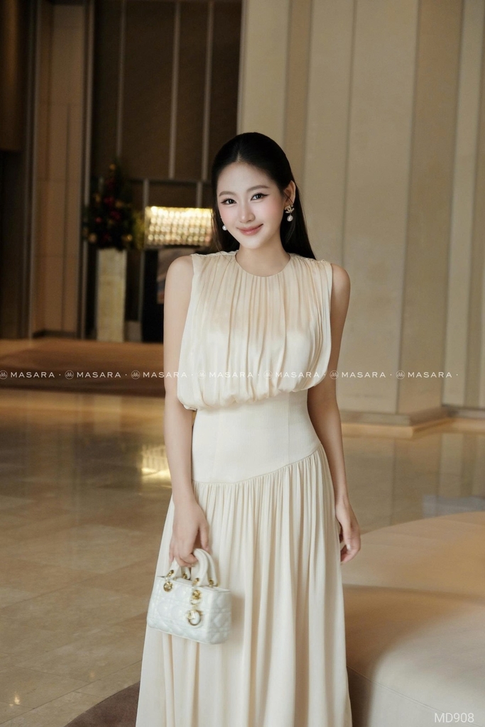 - Cổ tròn kín đáo, phần thân trên được xử lý xếp ly dọc mềm mại, tạo hiệu ứng rủ nhẹ giúp tổng thể thanh thoát và che khuyết điểm tinh tế.
