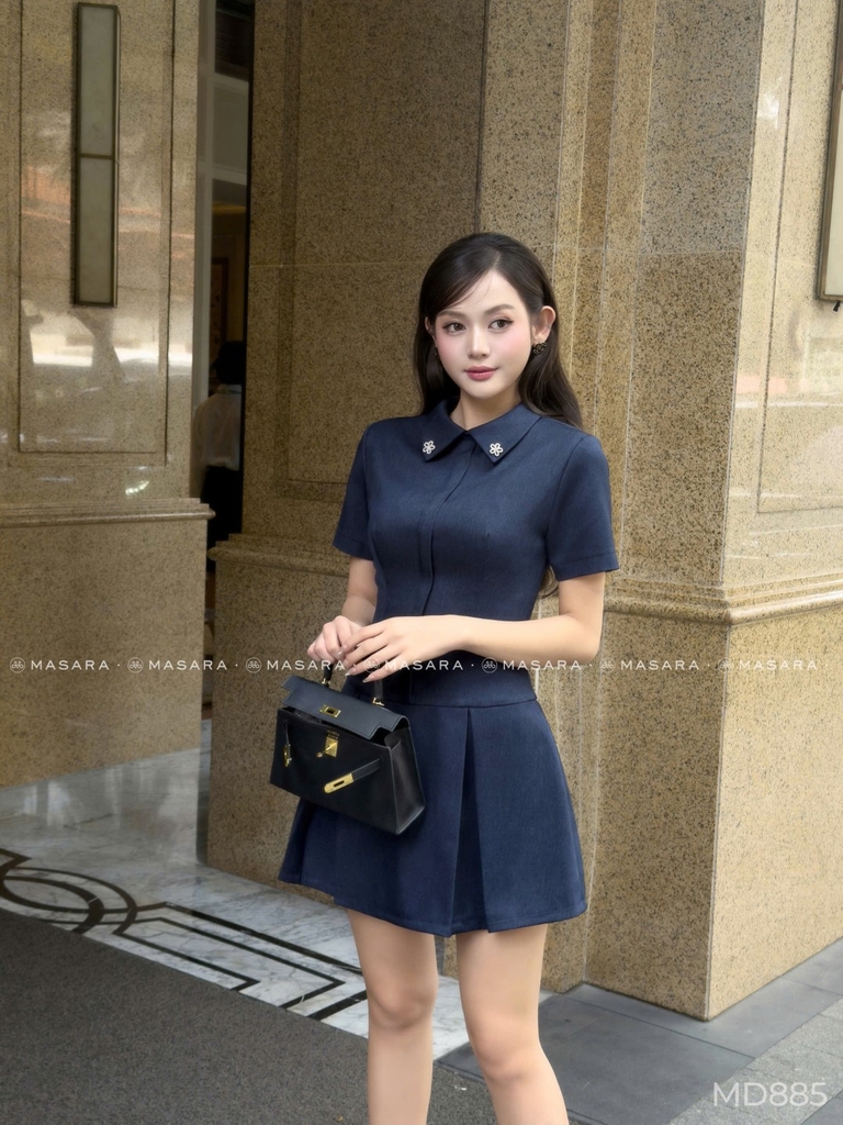 - Cổ sơ mi nhỏ đứng phom, đính charm hoa nhỏ lấp lánh hai bên cổ tạo điểm nhấn tinh tế.