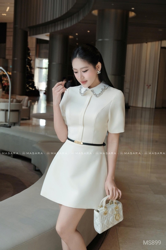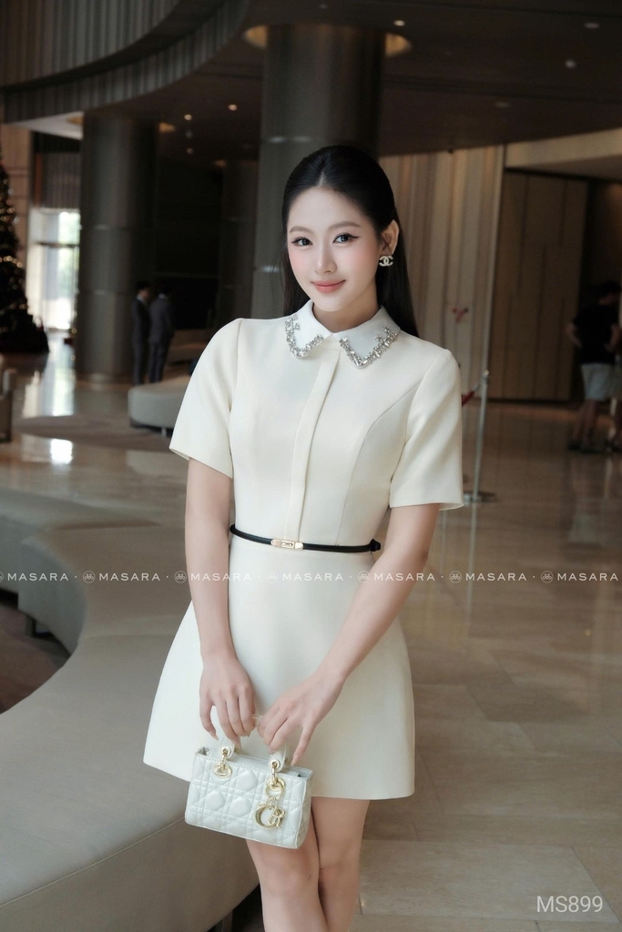- Thiết kế cổ peter pan màu trắng nổi bật, viền đính đá tinh xảo, mang hơi hướng cổ điển nhưng vẫn rất thanh lịch.