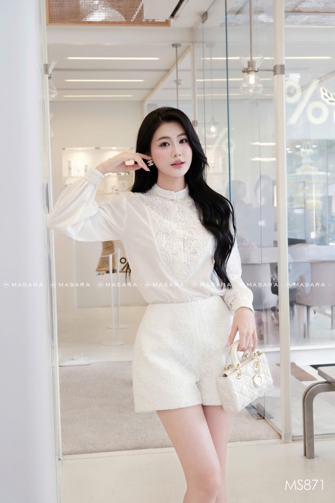 - Dáng áo suông nhẹ, thân trước nổi bật với mảng ren hoa nổi chạy dọc từ cổ xuống ngực rất sang