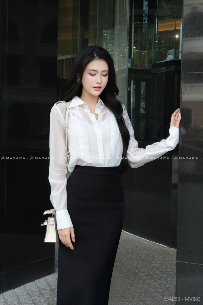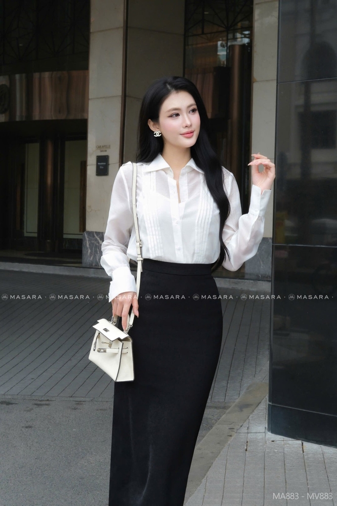 - Phần thân áo có các đường xếp ly dọc tinh tế, giúp tổng thể trông chỉn chu hơn