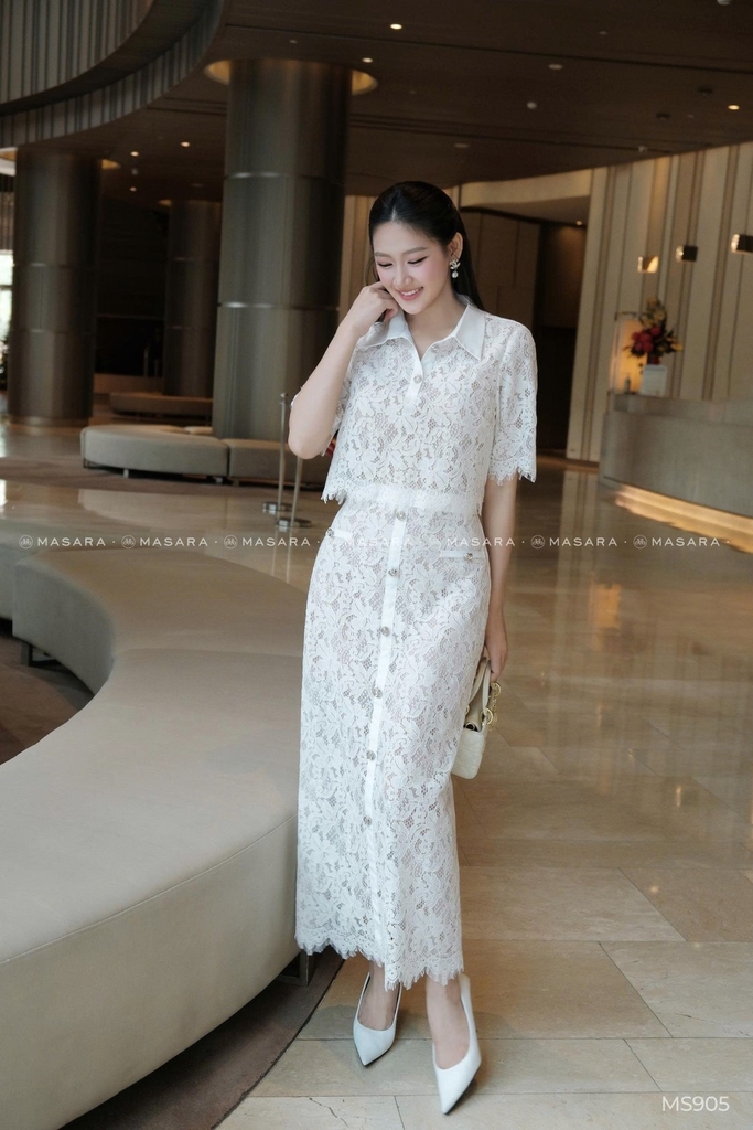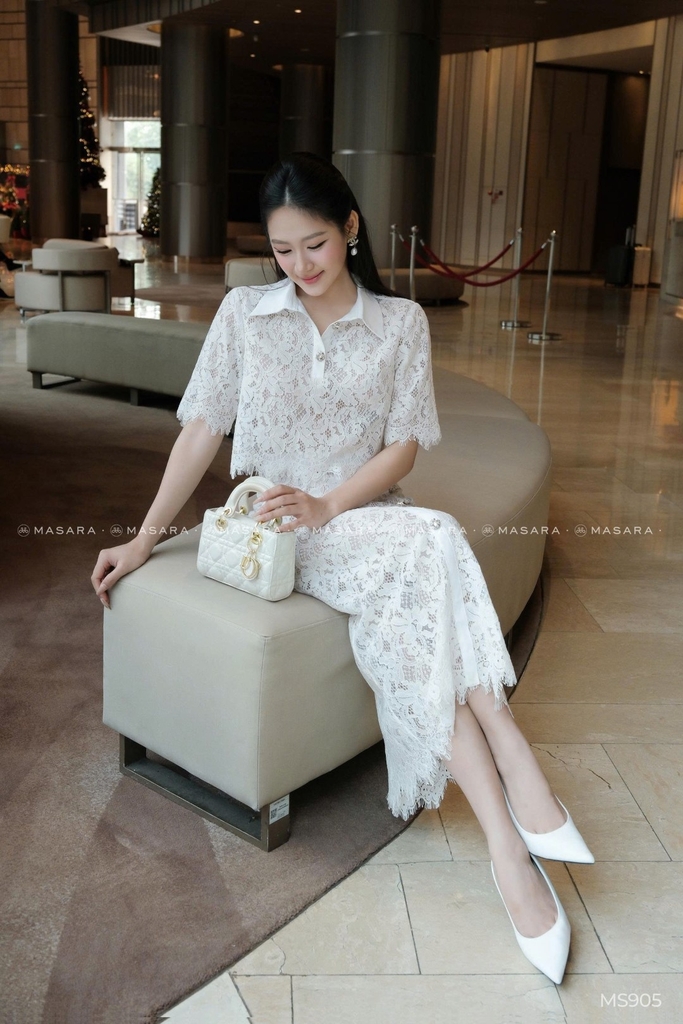 - Tay ngắn với viền ren mềm mại, giúp tổng thể gọn gàng nhưng vẫn nhẹ nhàng.