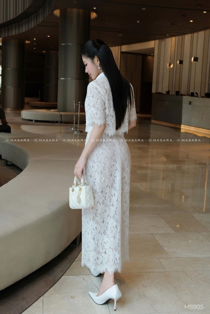 - Chân váy ren trắng dáng ôm suông, giúp tôn dáng nhưng không quá bó.