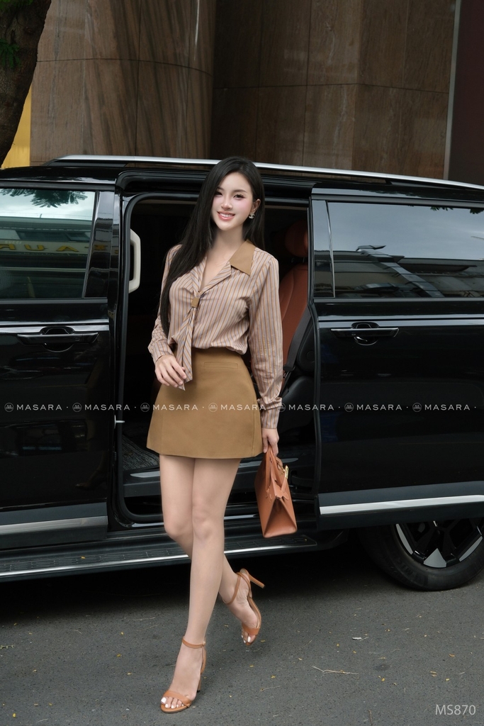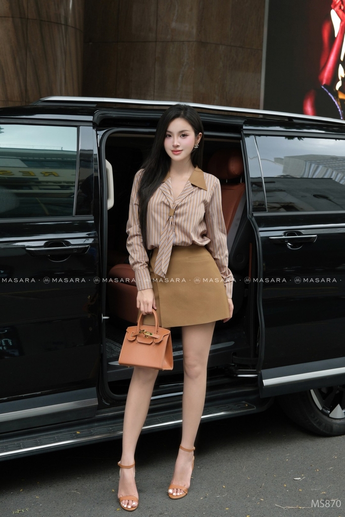 - Kate kẻ sọc nâu ấn tượng, phom áo rũ nhẹ, thoáng và lên form chuẩn.